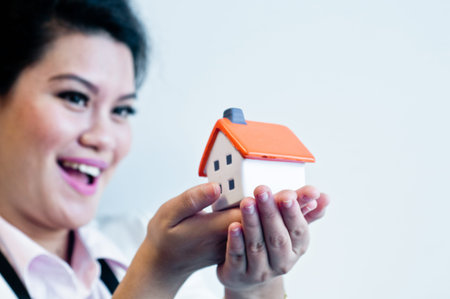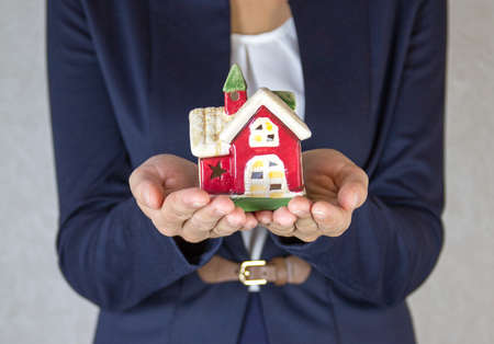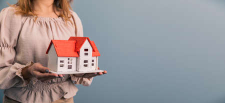Real estate agent with house model and keys, selling house,property owner mortgage concept with copy space on gray background space for text