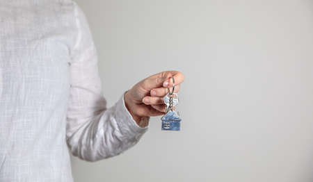 real estate concept. Real estate broker holding a home keychain in his hand.