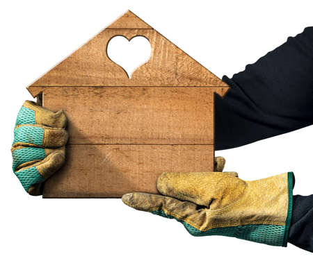 Closeup of two hands with protective work gloves holding a small wooden house with a heart-shaped hole. Isolated on white with copy space.