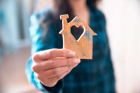 Miniature wooden home placed on the white ceramic cup. Home care, Home for sale concept.
