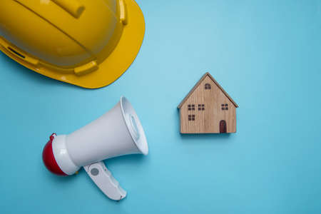 Announcement and announce advertising background public relations about construction building, home, house and real estate with megaphone and yellow helmet on blue background