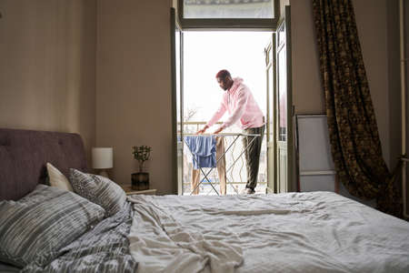 Householder putting clothes on piles after washing and drying while cleaning at home