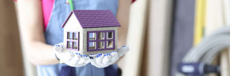 Body part of woman with small wooden house in hands. Crop unrecognizable person holding small toy house. Concept of purchasing new apartment and roof overhead.