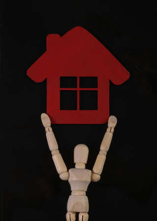 Small house made of wooden blocks on a blue background. Suitable for an article or advertisement on the topic of real estate, insurance, rent or sale.