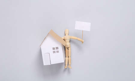 house for sale. Paper house and puppet with blank sign, laptop on gray background