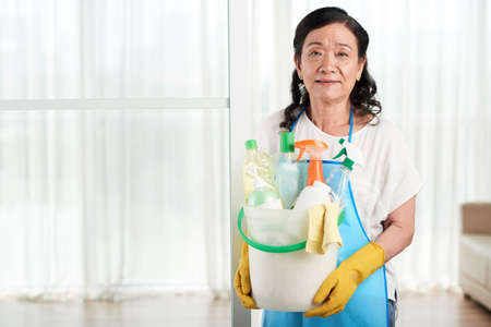 Man janitor holding basket of cleaning supplies preparing to clean at house