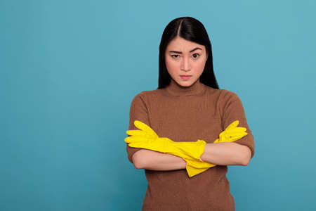 Mature angry unhappy asian female from chores crossed hands, Housewife worker, Cleaning home concept, Stressed overwhelmed and sad woman with negative state of mind look at front