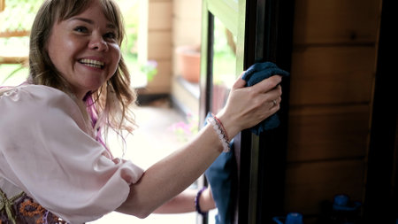 A cute cheerful woman does cleaning, washes the glass door in her house.