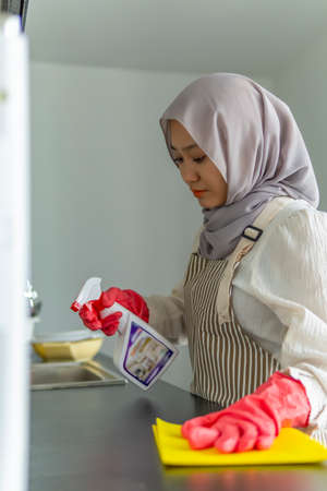Lifestyle at home, cute malay woman doing housework by cleaning the kitchen