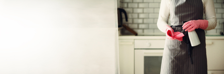 Woman in pink rubber protective gloves wiping dust and dirty. Cleaning concept, banner, copy space