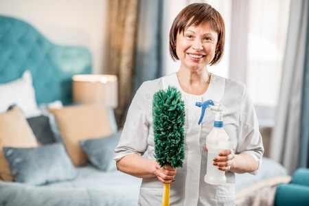 Portrait of a senior chambermaid in uniform standing with dust brush and cleanser in the beautiful hotel bedroom
