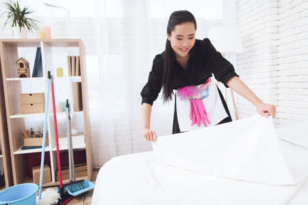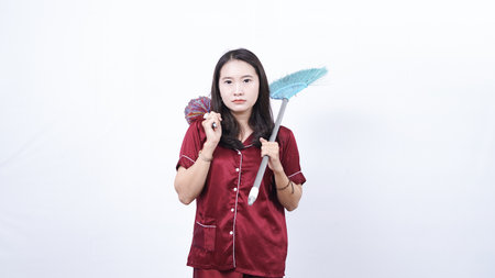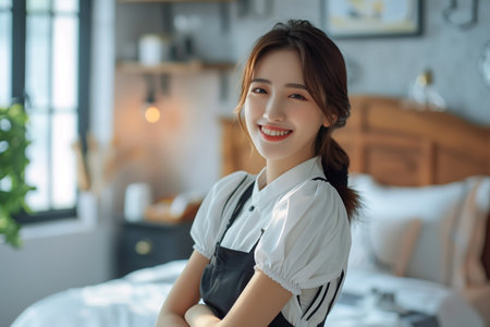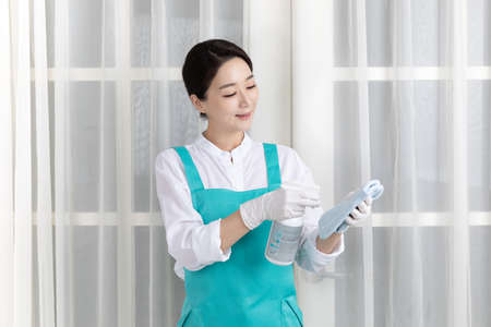 Asian woman wearing white shirt and apron, professional home cleaning service job