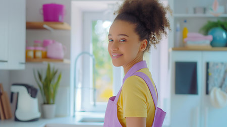 Portrait of happy and successful african-american housewife who is ready for housework.
