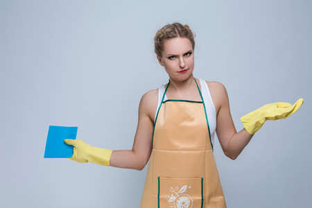 Full length portrait of helpless woman wearing orange rubber gloves, brown apron and jeans washing floor at home, standing with shrugging shoulders and spreading hands, looks confused,