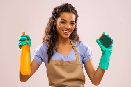 happy chambermaid in rubber gloves holding holding spray bottle and rag