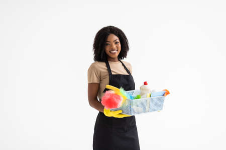 Cheerful millennial housewife holding bucket full of cleaning supplies at modern apartment kitchen. Portrait of cheerful young lady with sanitary equipment looking at camera and smiling