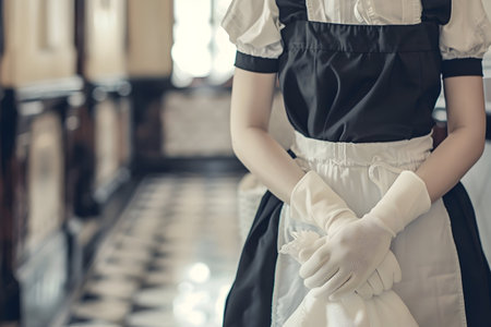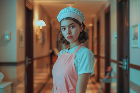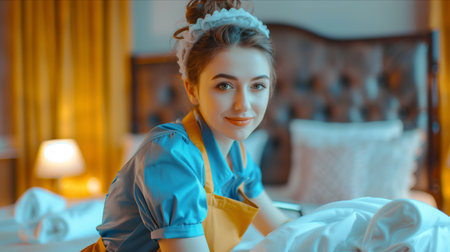 A hotel maid in a uniform cleaning the rooms in a hotel