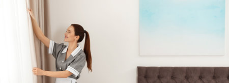 Chambermaid adjusting curtains in hotel room, space for text. banner design