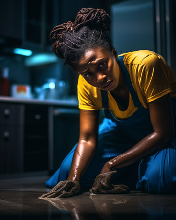 Exhausted Housekeeper Rests In Hotel Bedroom Floor After Long Day.