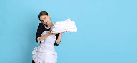 Young attractive chambermaid in uniform with stuck of fresh towels talking on phone isolated over blue background. Flyer