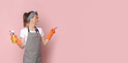 Spring Cleaning Offer. Young Professional Housemaid In Apron Pointing Aside At Copy Space On Pink Background, Panorama