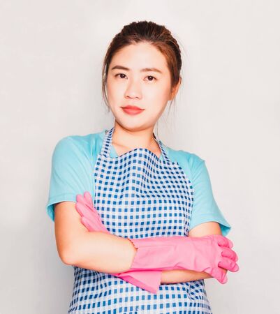 Housework concept, Housemaid is wearing gloves and apron to prepare cleaning the house.