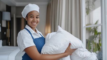 A young female housekeeper dressed in a white uniform is holding a fluffy pillow while standing in a bright hotel room. The image highlights hospitality, cleanliness, and professionalism.
