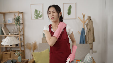 asian cleaning woman suffering a sudden crick in her neck is groaning and exercising the muscles while using a hoover for chores in the living room at home