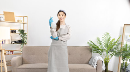 Beautiful Asian housewife wearing apron and cleaning gloves prepares to clean her house, Housework, Daily routine, Big cleaning, Clean and remove germs and dirt in the house, Clean up on weekends.