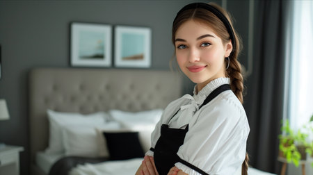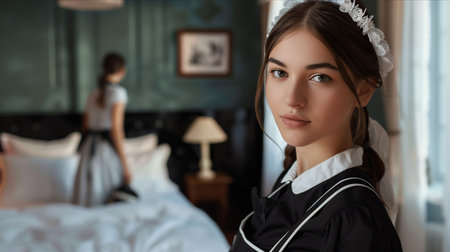 A poised maid in traditional attire stands gracefully in a grand corridor, embodied timeless classic elegance