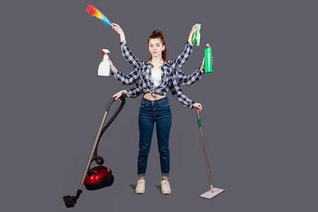 A girl on a gray background in the studio. isolate. A young woman with six hands, house. Vacuum, mop, detergent, dust collector, brush, rag. Robot machine for cleanliness. Cleaning company. Fast