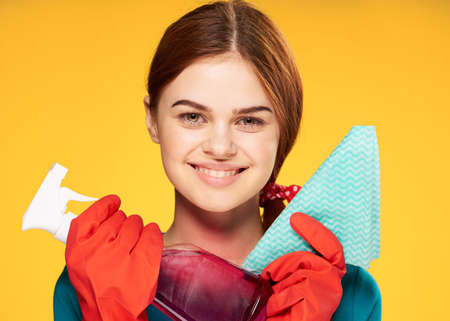 cleaning lady in red rubber gloves with a rag in her hands housekeeping