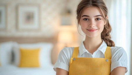The Caucasian housekeeper is confident in cleaning the hotel rooms.