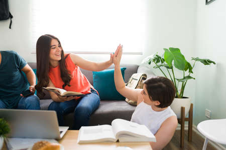 Give me a high five, my friend! Female college students smiling and celebrating after finishing their homework