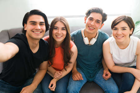 Personal perspective of a diverse group of college friends smiling and taking a selfie to post on social media while hanging out at home