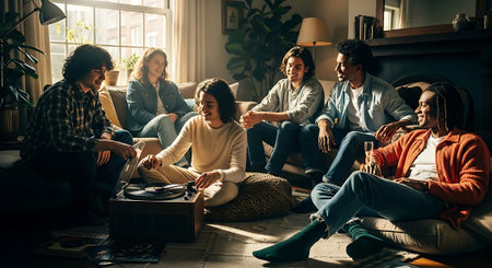 Friends enjoying a relaxed conversation in a cozy living room on a winter evening