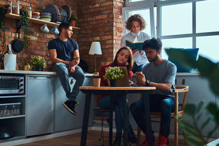 Kitchen in student dormitory. Group of interracial students engaged in education.