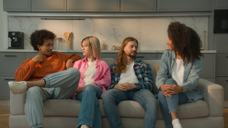 Group friends talking sitting in a couch in the living room
