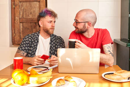 Couple of gay men in the kitchen having breakfast with the laptop
