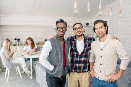 Three young male friends posing on camera while girls sitting at table behind them, horizontal shot