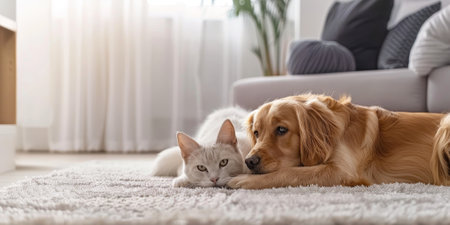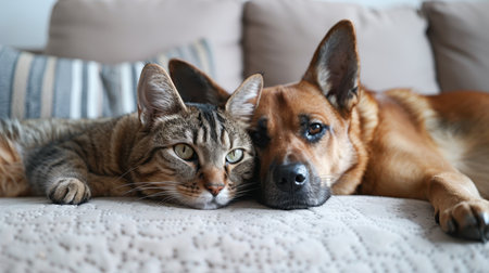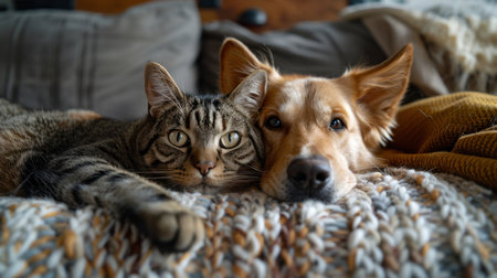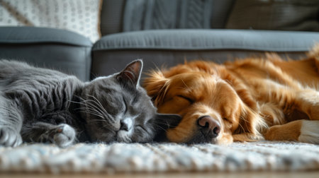This heartwarming image features a dog and cat peacefully resting side by side, showcasing the bond of companionship in a serene indoor setting.