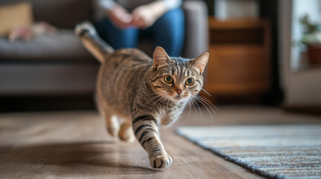 A close-up captures a domestic cat, featuring a mix of gray and white fur, set against a sunlit indoor scene. The composition highlights the cat with a soft focus background. Natural light bathes the space, suitable for various editorial and commercial applications. The image offers copy space.