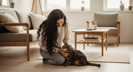 Young woman playing with cute cat, sitting together at home during coronavirus quarantine. Stay home stay safe. Isolation at home to prevent virus epidemic. Hipster girl with cat in modern room