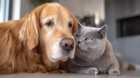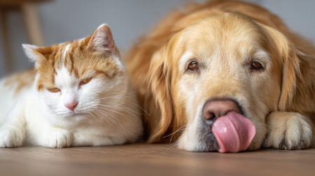 A golden retriever and a cheerful ginger cat snuggle on a soft rug indoors.