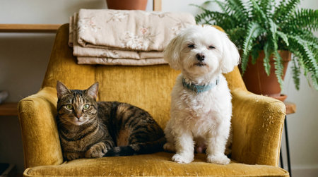 a tabby cat and a white dog are sitting on a yellow chair with a plant and a folded blanket in the background in an indoor setting