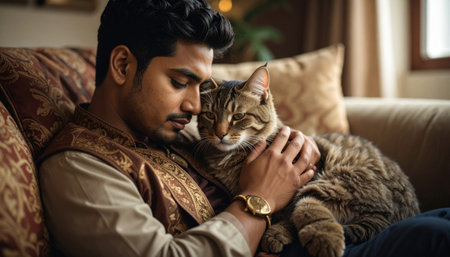 Men with cute cat resting at home. Pussycat in the hands of the owner. Favorite pet