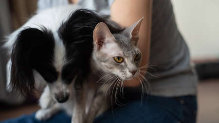 A woman holds in her hands a brush sphinx cat and a papillon dog