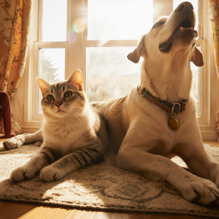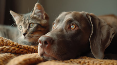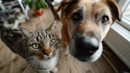 A heartwarming close-up of a curious cat and dog showcasing their companionship in a cozy indoor environment filled with natural light.