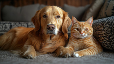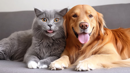 Happy Golden Retriever Dog and Gray Cat Relaxing Together on Sofa, Friendship Between Pet Concept.
