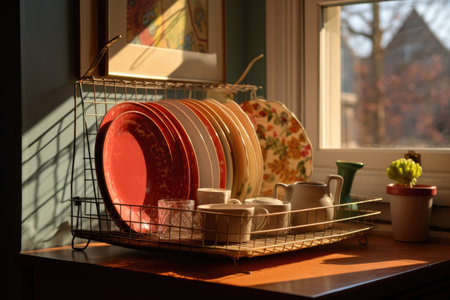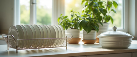 A serene kitchen setting features a gleaming dish rack filled with pristine plates beside vibrant green plants. The warm sunlight streaming through the window creates a cozy atmosphere, highlighting the harmony between nature and home.